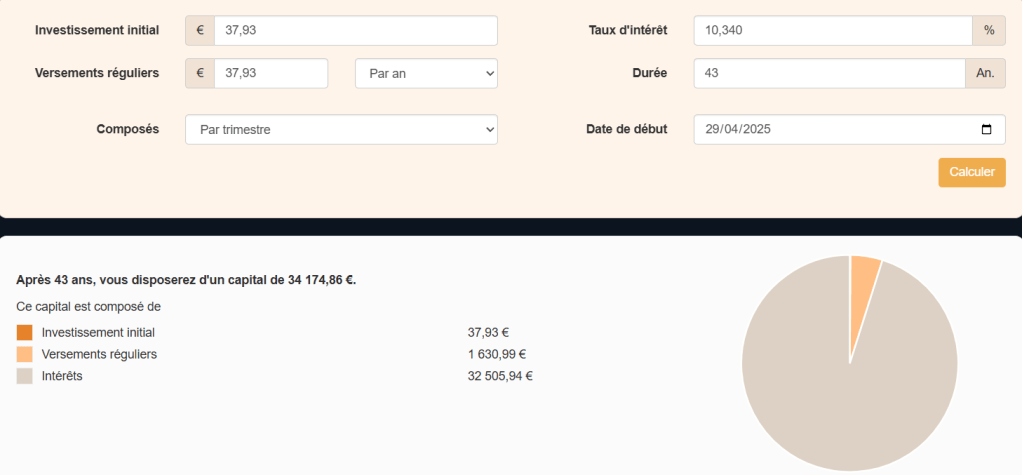 Et si vous réinvestissez ces intérêts dans un indice comme le S&P500, à la fin de votre carrière, vous aurez gagné :